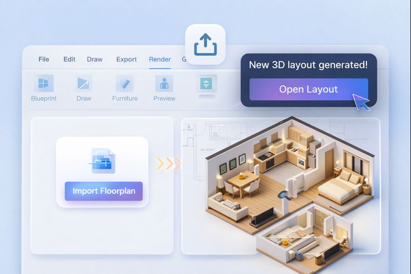 Advanced algorithms convert lines and shapes into 3D walls, doors, and windows in seconds.
